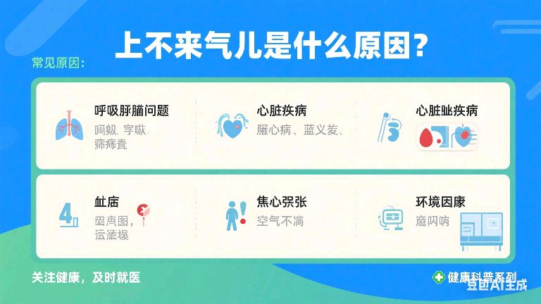上不来气儿(呼吸困难)的常见原因包括心肺疾病(如哮喘、心衰)、贫血、焦虑或过度换气综合征等,需结合伴随症状及病史综合判断。突发严重呼吸困难或伴随胸痛、意识模糊时,应立即就医。