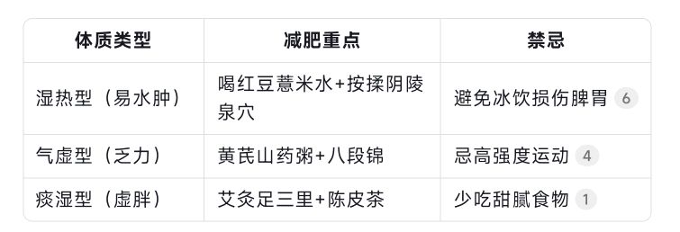 - 痰湿型(虚胖):减肥重点是艾灸足三里+陈皮茶,禁忌为少吃甜腻食物。