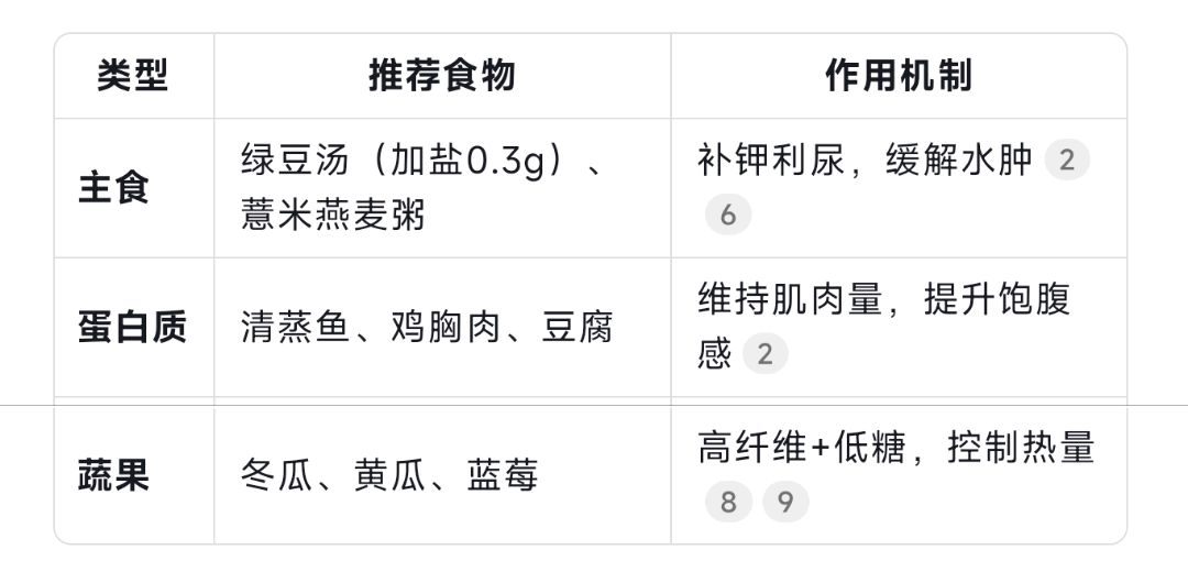 - 主食:推荐绿豆汤(加盐0.3g)、薏米燕麦粥,作用机制为补钾利尿,缓解水肿。