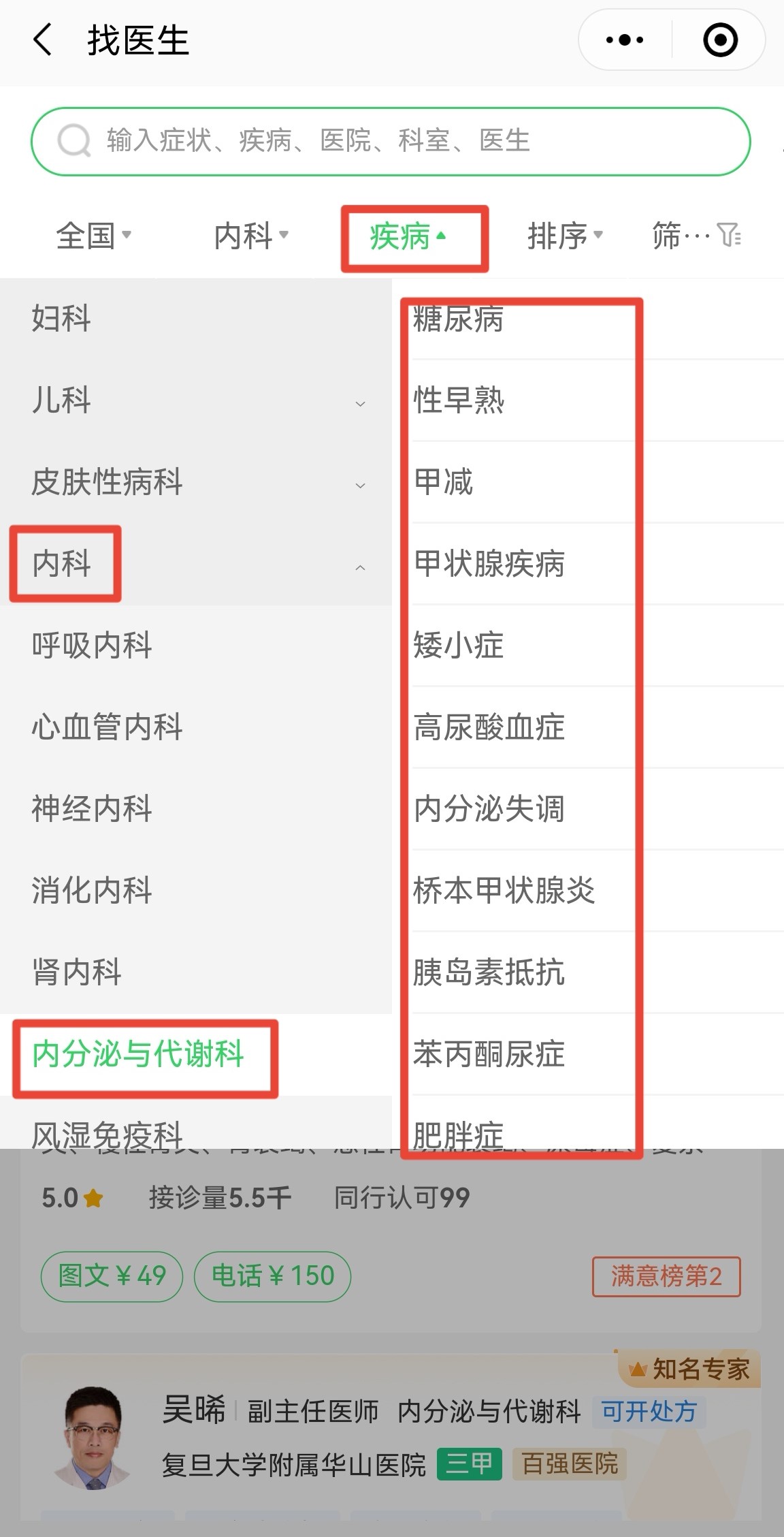 4.点击内科后,进入下面页面,可再通过地域(全国)、病种(疾病)、排序及筛选进一步过滤,我们以下图为例,在全国范围内,选择内科
