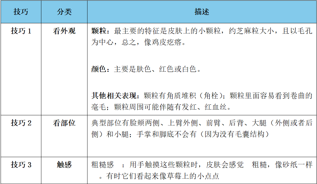 如果自己拿不准是不是鸡皮肤,可以正规就医评估。下面的表格,是我们结合经验和文献报道,梳理的鸡皮肤的判断技巧,可供参考。